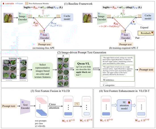 Overall flowchart. (1) Shows the baseline framework, where the left side (a) is the training-free APE and the right side (b) is the training-required APE-T. (2) Shows the image-driven prompt text generation module. (3) Shows the text feature fusion process in VLCD, where corresponds to of APE in (1), and corresponds to of APE and APE-T in (1). (4) Shows the text feature enhancement process in VLCD-T, where corresponds to of APE-T in (1).