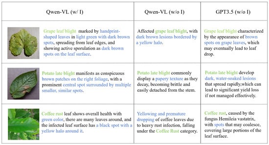 - Prompt text generation: We sequentially input the selected representative images from each category into Qwen-VL, employing the following unified template command for querying: “Can you help me describe this [CLASS] leaf?”, where [CLASS] is replaced with the specific disease category. This operation aims at generating detailed descriptions that are closely aligned with the image content. As shown in Figure 2, we show three different categories of crop diseases, the prompt text generated by Qwen-VL with image-driven guidance, and the prompt text generated by the language model GPT3.5 [40] and Qwen-VL without image-driven guidance. For instance, in the image-driven prompt text generated for the “grape leaf blight” category, “dark brown spots” are identified as crucial indicators of the disease, and the generated text also describes additional information about the blade surface. In contrast, without image-driven guidance, although the text generated by GPT3.5 and Qwen-VL also includes relevant disease features, it is not as detailed as the prompt text generated with image-driven input.
