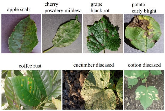 The dataset used in our study integrates the Plant Village dataset [41] with self-expanded data. Plant Village, meticulously constructed by Hughes et al., is a large-scale image repository widely used in the global plant pathology community, encompassing over 50,000 high-quality images showcasing diverse states of 14 crop species under the influence of 17 fungal diseases, 4 bacterial diseases, 2 viral diseases, 2 oomycete diseases, and 1 moth infestation. Plant Village mainly uses pictures collected in a laboratory environment; in order to increase the richness of the images, we intentionally augment the dataset by incorporating publicly available images covering 16 novel diseases and additional categories, sourced from a wide variety of backgrounds, including multiple crop samples and diverse laboratory and field settings. The resulting consolidated dataset consists of 54 disease classes and comprises a total of 57,495 images, as detailed in Table 1. Figure 3 presents sample data, with the top row displaying representative images from Plant Village and the second row featuring newly added non-laboratory-environment samples.
