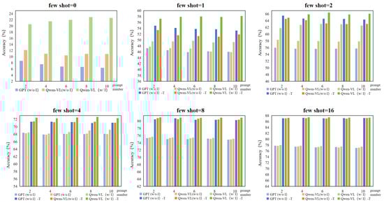 In the training-free setting, we compare the cases with shots of 0, 1, 2, 4, 6, 8, and 16. In the training-required setting, we compare the cases with shots of 1, 2, 4, 6, 8, and 16. The results indicate that, under both the training-free and training-required settings, the classification accuracy increases with more shots. When the shot number is small, employing representative images selected via clustering to generate prompt texts exhibits a more pronounced advantage. For example, in the training-free setting, the classification accuracy of prompt texts generated by randomly selecting pictures is 21.62% under 0-shot setting, whereas utilizing cluster-selected images leads to an improved accuracy rate of 22.59%. As the number of shot increases, the difference in accuracy rates between the use of cluster-selected images for generating prompt texts and randomly chosen images diminishes; however, the former consistently maintains a marginally higher performance throughout. This observation substantiates that the methodology of inputting cluster-selected images into Qwen-VL to generate prompt texts for classification purposes is indeed more efficacious.