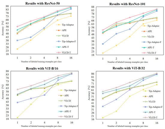 In the training-required setting, we compare VLCD-T with five methods that require training: CoOp [21], KgCoOp [23], CLIP-Adapter [24], Tip-Adapter-F [6], and APE-T [7]. Our VLCD-T outperforms previous methods in all few-shot settings and achieves the highest accuracy. Notably, when the few-shot setting is 1 or 2, VLAD-T’s classification accuracy improves by 4.73% and 3.89%, respectively, compared to using APE-T. These results convincingly demonstrate that VLCD-T can more effectively capture critical and discriminative features from inter-class prompt texts, thereby enhancing the overall performance of the model.