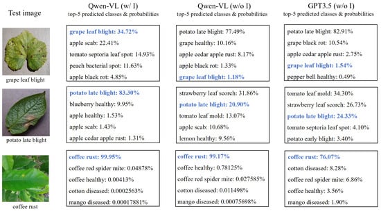 We study the impact of three different prompt text generation strategies on specific crop classification recognition: one is to use the language model GPT3.5 to generate non-image-driven prompt texts, another is to generate non-image-driven prompt texts using Qwen-VL’s text answering, and the last is to utilize Qwen-VL’s image comprehension to generate image-driven prompt texts. Figure 6 shows the top five classification prediction results of each strategy on three specific crop test images, including the top five possible categories predicted along with the probability associated with each prediction. The figure reveals that, among the three specific categories of test images shown, when using the image-driven generated prompt text for classification, its top five prediction categories and accuracy are significantly better than the other two non-image-driven prompts text generation methods. When all three methods correctly predict the category, such as “coffee rust” in the table, the predicted probability using the image-driven prompt text for classification is also higher than the other two methods. This finding underscores that the integration of image information in prompt text creation leads to improved generalization within model testing, thereby offering more reliable and precise predictions in practical applications.