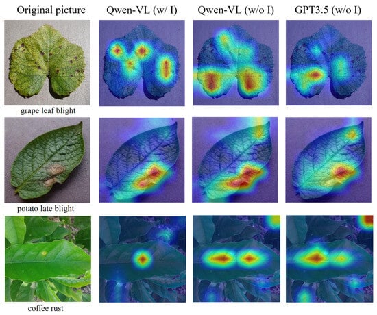 To gain deeper insights into how the model effectively focuses on the relevant visual features during the processing of prompt texts, we borrow the Grad-CAM (Gradient-weighted Class Activation Mapping) [45] visualization technology. Analogous to the work by Shen et al. [46], we adopt a heat map approach to display the image–text relevance, visually revealing the attention distribution that the model allocates to the critical feature areas within the crop disease imagery after receiving the textual prompts. In our experiment, we examine the effects of three different prompt text generation strategies on the model performance. For each test image, corresponding to its given prompt text, we employ Grad-CAM to visualize the attention distribution over the image following the receipt of these text prompts. The experimental results are shown in Figure 7. We find that, compared with the other two non-image-driven prompt text generation strategies, the image-driven prompt text generated by Qwen-VL can more accurately focus on the salient features pertaining to the provided descriptions.