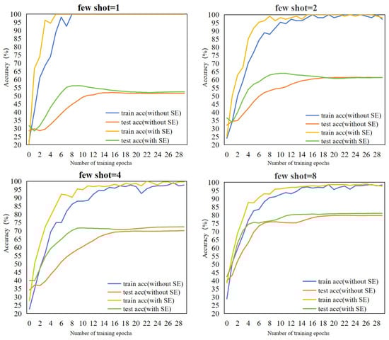 Dynamic evolution of the SE Attention mechanism on training and test set accuracy over training epochs for different few-shot settings. “without SE” represents not using SE Attention; “with SE” represents using SE Attention. The horizontal coordinate is the training epoch and the vertical coordinate is the classification accuracy. “train acc” represents the training accuracy and “test acc” represents the test accuracy.