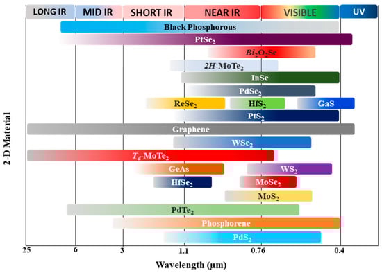 Spectral Response of some 2-D materials used in photodetection. Spectral response range data have been adopted from [23,25,26,27,28,29,30].