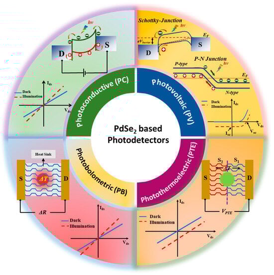PdSe2 photodetectors can be broadly categorized into four types based on the literature: photovoltaic, photoconductive, photothermoelectric, and photobolometric, as illustrated in Figure 2. The specific photodetection mechanism in a low-dimensional material-based detector can be a standalone phenomenon or a combination of these effects, depending on the internal potential developed or external applied potential, the internal light-matter interaction mechanism within the 2D layered material, and the distribution of the input light flux density.