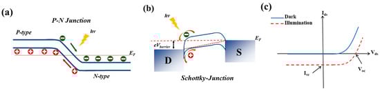 In a photovoltaic-type photodetector, the built-in electric field that enables the photovoltaic effect (PVE), originates from a p-n junction [31] or a Schottky junction [32] at the semiconductor-metal interface. This internal field separates the photogenerated electron-hole (e-h) pairs.