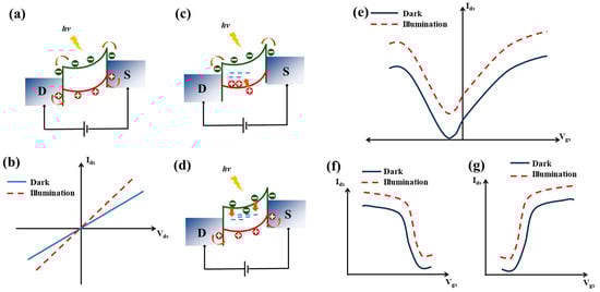 Photo-gated photodetectors are a class of photoconductive devices, often considered phototransistors, which utilize the photogating effect. Under illumination, the typical photoconductive generation of electron–hole pairs occurs. However, the application of a gate bias causes charge-trapping states to function as a localized floating gate, significantly modulating the channel conductance [39,40]. When photogenerated holes are trapped in positively charged hole-trapping sites, the remaining free electrons can roam for a longer time before recombining. This provides high gain and n-type doping characteristics (Figure 4c). The opposite occurs when electrons are trapped, resulting in p-type behavior (Figure 4d). This photogating mechanism allows for tuning the channel conductivity. By carefully designing the device, such as tuning the metal work function, photo-gated detectors can exhibit ambipolar transport characteristics (Figure 4e) or be optimized for unipolar operation [41,42] (Figure 4f,g). However, the charge trapping and detrapping processes leads to a sluggish photoresponse, which is a trade-off for enhanced photoresponsivity and gain [43,44].
