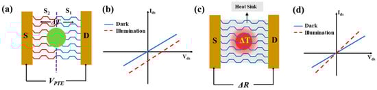 Localized light irradiation of a 2DLM can create a thermal effect known as the photothermoelectric (PTE) effect. The localized illumination generates a temperature gradient (ΔT) across the semiconductor channel, as the spot size is smaller than the channel dimensions [37]. This temperature differential (ΔT) induces a photothermoelectric potential difference (VPTE) across the channel ends, based on the difference in Seebeck coefficients (S1 and S2) of the material: VPTE = (S2 − S1)·ΔT. The units of VPTE are V/K. The development of this photo-induced thermoelectric potential, as shown in the typical Id-Vd characteristics in Figure 5b, allows PTE-based photodetectors to operate in a self-powered mode, without requiring any external bias voltage. The electrical conductivity of the channel material is closely related to the Seebeck coefficients S1 and S2 through the Mott formula: S = where Te is electron temperature, and the derivative of the conductivity σ with respect to energy εF must be evaluated at fermi energy [45,46]. It is important to note that global illumination can also cause the PTE effect in 2DLM, provided there is a strong absorption gradient within the channel to generate the necessary temperature differential and form VPTE, typically in the range of a few microvolts to millivolts. The sign of the photogenerated current depends on the difference in Seebeck coefficients of the channel material localities and the carrier polarity in the channel.