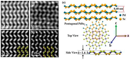 (a–d) Z-contrast STEM pictures of few-layer PdSe2 crystals (top row) and comparable simulated images of PdSe2 (bottom row) illustrate the atomic resolution structure of the material. There are even (a,c) and odd (b,d) numbers of layers, respectively. Atomic models of the relevant STEM pictures are shown in the insets in (c,d). Reprinted with permission from ref. [21] © 2017 American Chemical Society (e) crystal structure of 2D PdSe2 monolayer and few-layer systems. Reprinted with permission from ref. [49] © 2018 WILEY-VCH Verlag GmbH & Co. KGaA, Weinheim, Germany.