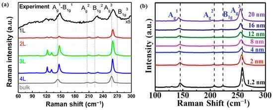 (a) Exfoliated PdSe2 nanosheets’ layer-dependent Raman spectra (monolayer to bulk) at 532 nm excitation laser wavelength. Reprinted with permission from ref. [21] © 2017 American Chemical Society (b) Raman spectra of PdSe2 films synthesized via CVD with varying thickness. Reprinted with permission from ref. [49] © 2018 WILEY-VCH Verlag GmbH & Co. KGaA, Weinheim.