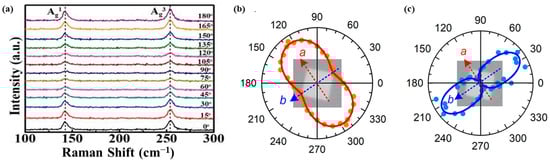 (a) Angle-resolved polarized Raman spectra of 2D PdSe2. Reprinted with permission from ref. [54]. © 2019 The Authors. Published by WILEY-VCH Verlag GmbH & Co. KGaA, Weinheim. (b,c) Polar plots for the 4L PdSe2 assessed under the copolarization configuration as a function of the azimuthal angle φ, showing Raman intensity of the Ag1 mode intensity (b) and second harmonic intensity (c) (a [red arrow] and b [blue arrow] are crystallographic axis of the flake). Reprinted with permission from ref. [53] © 2020 American Chemical Society.