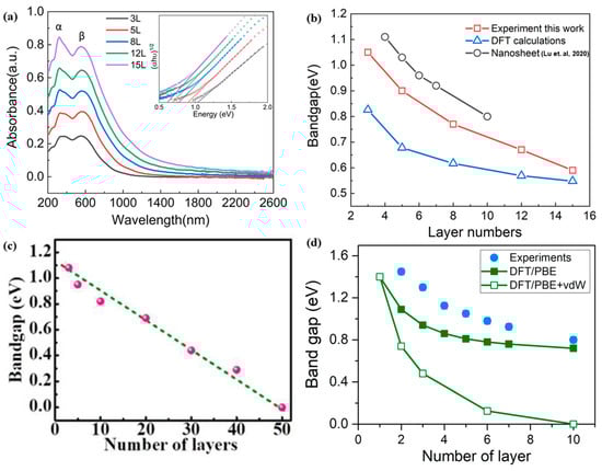 (a) absorption spectra and (b) Bandgap evolution of PdSe2 films with layer numbers ranging from 3L to 15L. The two major absorption peaks of PdSe2 films are represented by α and β, with corresponding tauc plots displayed in the inset. Experimental data of nanosheets was adopted from [53]. Adapted with permission from ref [56]. Creative Commons Attribution CC BY license. (c) The optical bandgaps extracted from Tauc plots for PdSe2 with different layer numbers. Reprinted with permission from ref. [49] © 2018 WILEY-VCH Verlag GmbH & Co. KGaA, Weinheim. (d) Optical band gap as a function of layer number determined by Tauc plot, along with representations of DFT-based assumptions. Reprinted with permission from ref. [53] © 2020 American Chemical Society.