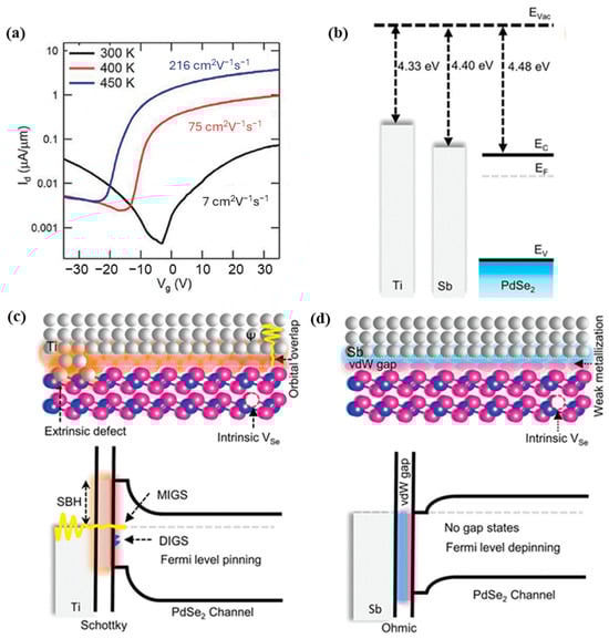As discussed earlier, PdSe2 has demonstrated structural anisotropy, suggesting the potential for anisotropic electronic behavior. The 2DLMs with high charge carrier mobility are favorably desirable for photodetector applications, as this enables more efficient collection of charge carriers and improved device speed. Existing reports on the transport characteristics of PdSe2 have revealed ambipolar conduction, whereby the material can exhibit both n-type and p-type behavior, which can be tuned through vacuum annealing or annealing in an inert environment [60]. Multiple PdSe2 field-effect transistors (FETs) fabricated with gold (Au) contacts, without any annealing treatment, have exhibited maximum (average) electron field-effect mobilities (µe) of 54 cm2V−1s−1 (17 cm2V−1s−1) and hole mobilities (μh) of 14 cm2V−1s−1 (7 cm2V−1s−1) [19]. These mobility values are notable in comparison to the diverse range of mobility (1–50 cm2V−1s−1) reported for the widely studied MoS2 material. Vacuum annealing of the PdSe2 FETs at 450 K resulted in an increase in electron mobility, reaching 216 cm2V−1s−1 [61], and a transition towards n-type dominant behavior (Figure 10a). Further improvements in room-temperature electron mobility, up to 383 cm2V−1s−1, have been reported for PdSe2 devices with van der Waals (vdW) contacted antimony (Sb) source-drain electrodes [19]. The vdW gap between the Sb contacts and the PdSe2 channel led to Fermi level depinning and effective work function alignment, minimizing the Schottky barrier height (Figure 10b–d) and reducing the contact resistance to as low as 0.55 kΩ.