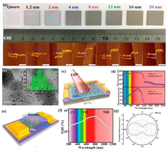 (a) Digital camera photo of PdSe2 films with different thicknesses grown on the quartz; the bottom pictures show the corresponding AFM images. The blue line represents the direction of height measurement and red line denotes the height profile (b) TEM image of BPQDs with an average diameter of 3.5 ± 0.5 nm. Statistical analysis of the lateral sizes of 160 BPQDs (inset) (c) Schematic illustration of a BP-QD-PdSe2/Si detector, (d) The spectral response of PdSe2/Si with and without BPQDs decoration. Adapted with permission from ref. [49] © 2018 WILEY-VCH Verlag GmbH & Co. KGaA, Weinheim. (e) Schematic illustration of PdSe2/perovskite hybrid junction detector. (f) The wavelength-dependent external quantum efficiency (EQE) of PdSe2/perovskite device at zero bias. (g) The evolution of photocurrent as a function of different polarized angle. Reprinted with permission from ref. [54] © 2019 The Authors. Published by WILEY-VCH Verlag GmbH & Co. KGaA, Weinheim.