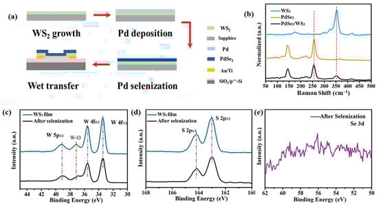 (a) Schematic of the device fabrication process. (b) Raman spectra of the stacked film extracted from the regions corresponding to WS2, PdSe2, and PdSe2/WS2 respectively. (c) XPS spectra of W 4f peak. (d) XPS spectra of S 2p peak. (e) XPS spectra of Se 3d peak. Adapted with permission from ref. [68]. © 2021 Wiley-VCH GmbH.