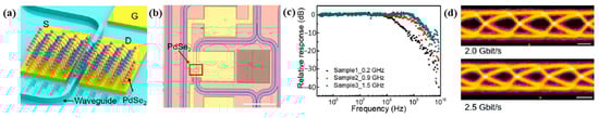 (a) Schematic (b) Optical micrograph illustration of waveguide integrated PdSe2 photodetector. (c) Measured frequency response of three PdSe2 photodetectors at 3 V. (d) Receiver eye diagram at a data rate of 2.0 and 2.5 Gbits−1 measured with PdSe2 photodetector. Reprinted with permission from ref. [71]. Copyright © 2022 American Chemical Society.