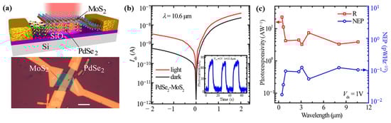 Long-wavelength infrared operation of PdSe2-MoS2-based heterostructure field-effect transistors (FETs) has been reported by [72] (Figure 16a). The response times were 74.5 ms (rise) and 91.3 ms (fall) in the 10.6 μm wavelength range (Figure 16b), and the devices showed a broad spectral response from 450 nm to 10.6 μm with exceptional performance, with regard to responsivity of 42.1 A/W (Figure 16c) and a detectivity of 1.10 × 109 Jones at a wavelength of 10.6 μm. The authors noted that the use of Pd/Au contacts could facilitate a reduction in dark currents (Figure 16b), thereby improving the on/off ratio and overall device performance.