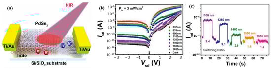 Broadband photodetection has been reported for PdSe2-InSe heterostructures [73], spanning the visible to near-infrared (NIR) wavelength range (Figure 17a). These devices exhibited response speeds in the millisecond range and a high responsivity of 161 A/W in the NIR region (1250 nm). The device performance was further enhanced by gate-tunable photocurrent, indicating electron-dominated transport characteristics. Additionally, the PdSe2-InSe heterostructures demonstrated appreciable switching speeds and extended detection capabilities up to 1650 nm (Figure 17b,c), which exceeds the individual responses of the PdSe2 and InSe devices. On the other hand, a robust p-n junction based on BP-PdSe2 heterojunctions has been reported [74]. In this device, asymmetric contact engineering was employed, where the BP side was deposited with Cr/Au contacts and the PdSe2 side was deposited with Sc/Au contacts. This approach provided a robust rectification behavior, with further tunability achieved by varying the back-gate voltage. The BP-PdSe2 heterojunction device exhibited a broadband response from 532 nm to 1310 nm, with a high responsivity (>105 A/W) and external quantum efficiency (>106%). The device also demonstrated a high detectivity reaching 1013 Jones, indicating its potential for highly sensitive photodetection applications.
