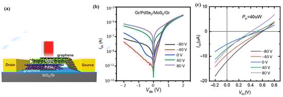 (a) Schematic of the graphene-sandwiched PdSe2/MoS2 vdWH photodetector. (b) Output curves at various gate voltages from −80 to 80 V. (c) Photoresponse characteristics of the device at various gate voltages with notable Voc and Isc. Adapted with permission from ref. [75] © 2023 Wiley-VCH GmbH.
