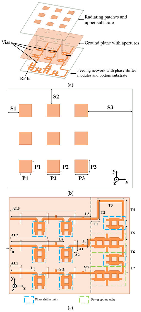 Proposed 3 × 3 phased array antenna: (a) exploded view, (b) top view of the radiating patches and upper substrate, and (c) top view of the lower substrate with a feeding network.