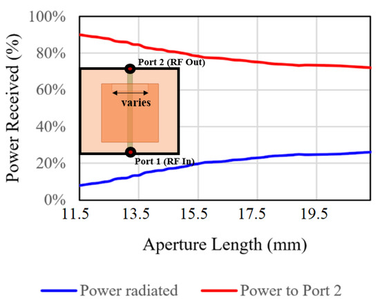 The position of the aperture in an aperture-coupled patch antenna determines the input impedance, while its length dictates how much power radiates [9]. The longer the aperture is, the more the antenna radiates. However, the radiated power levels off as the aperture length increases, as shown in Figure 2, which illustrates the power distribution for different aperture lengths in a 22 mm × 22 mm radiating element of an antenna array with a 3 mm aperture width. The substrates are Rogers 4003C with a thickness of 60 mils.