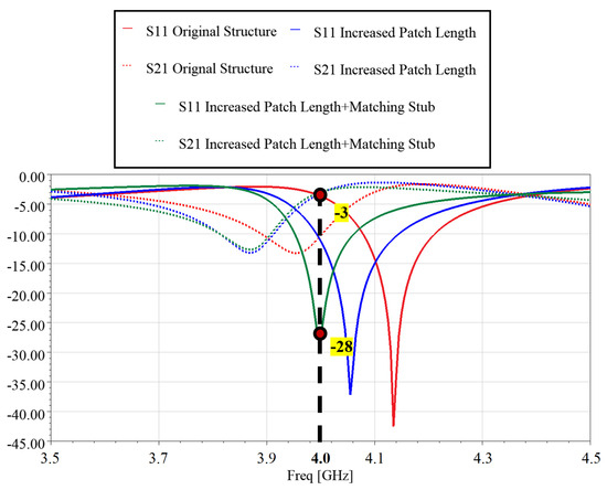 To overcome such a shortcoming, a stub at the feed transmission line is used to achieve a specified radiated power for each patch element beyond the otherwise limited level while minimizing signal reflection. While designing each element, the patch size [10] has to be adjusted to compensate for any frequency shift, as shown in Figure 3. The figure shows transmission performances for different techniques used to design a single aperture-coupled element with a 1:1 power divider at 4.0 GHz.
