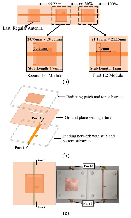 The module’s breakdown and analysis: (a) subarray analysis, (b) experimental setup of proposed aperture coupled structure in exploded view, and (c) top view of one of the modules.