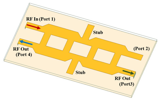 A novel power splitter with quadrature hybrids is placed between neighboring subarrays. The proposed power splitter, as shown in Figure 9, is a sequential connection of quadrature hybrids complemented by additional stubs. Such an arrangement enables accurate control over power division. Port 1 functions as the input, Port 2 is isolated, while Port 3 and Port 4 are outputs after the required power splitting.