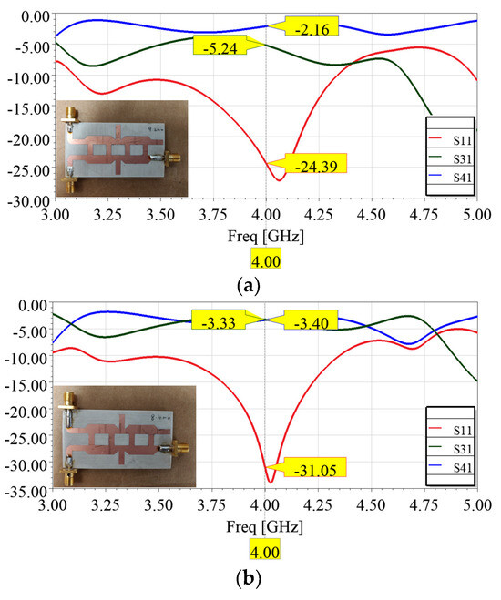 The isolation of Ports 1 and 2 is apparent, allowing for unimpeded signal transmission. Meanwhile, Ports 3 and 4 offer the flexibility to split the power from Port 1 to any desired level by varying the stub length. Figure 11 shows the prototypes and their performances with the proposed power splitters.