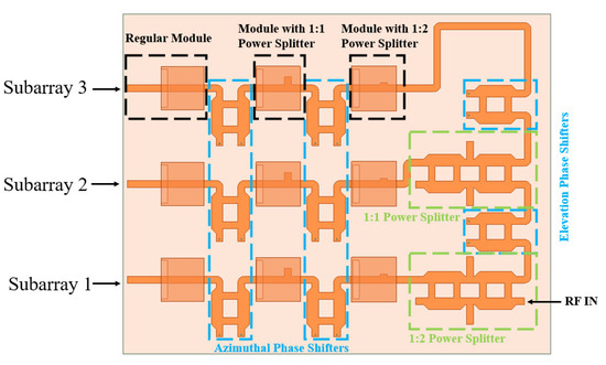 Each subarray comprises three modules. Integrating power splitters within these modules ensures even power distribution among the individual elements. Ultimately, this design scheme guarantees uniform power distribution across all nine elements.