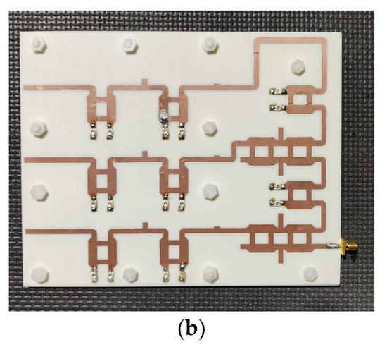 The proposed antenna under test: (a) the front side with radiating patches and (b) the back side with the feeding network.