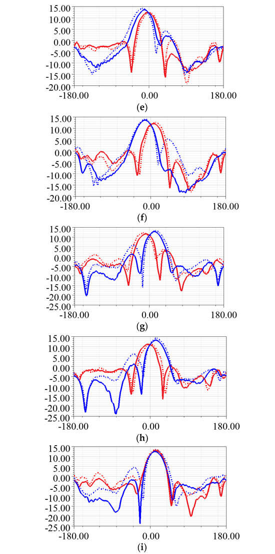Comparing the radiation patterns between simulation and measured data under various conditions. (a) Azimuthal phase shifters with a capacitance value of 1.5 pF and elevation phase shifters with a capacitance value of 2.0 pF. (b) Azimuthal phase shifters with a capacitance value of 2.0 pF and elevation phase shifters with a capacitance value of 2.0 pF. (c) Azimuthal phase shifters with a capacitance value of 3.0 pF and elevation phase shifters with a capacitance value of 2.0 pF. (d) Azimuthal phase shifters with a capacitance value of 1.5 pF and elevation phase shifters with a capacitance value of 3.0 pF. (e) Azimuthal phase shifters with a capacitance value of 2.0 pF and elevation phase shifters with a capacitance value of 3.0 pF. (f) Azimuthal phase shifters with a capacitance value of 3.0 pF and elevation phase shifters with a capacitance value of 3.0 pF. (g) Azimuthal phase shifters with a capacitance value of 1.5 pF and elevation phase shifters with a capacitance value of 1.5 pF. (h) Azimuthal phase shifters with a capacitance value of 2.0 pF and elevation phase shifters with a capacitance value of 1.5 pF. (i) Azimuthal phase shifters with a capacitance value of 3.0 pF and elevation phase shifters with a capacitance value of 1.5 pF.