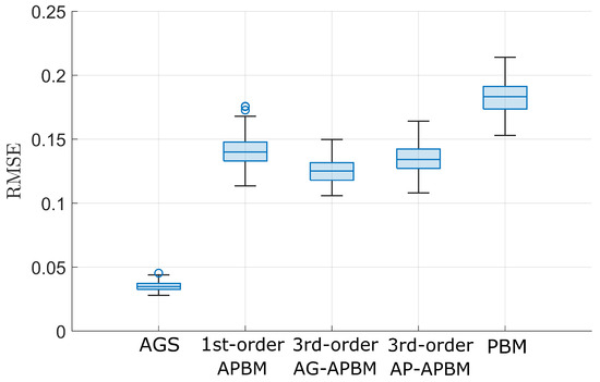 Box plots for the root mean square error (RMSE) of state estimation for the autoregressive-3 (AR(3)) model computed over 200 Monte-Carlo (MC) simulations. The central line in the box indicates the median. The bottom and top edges of the box denote the 25th and 75th percentiles, and the circles denotes the outliers. The AGS and PBM represent the estimation based on the true model and AR(1) model.
