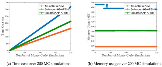 It is shown that for AP-APBM, the time cost and memory usage are larger than the cost of the 1st-order APBM, since the extra memory is used to store the approximation when estimating . However, the computational cost of the AP-APBM has been greatly reduced compared to the AG-APBM excluding the extra augmented state.