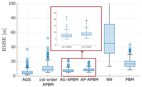 Figure 3 shows the box plot of the RMSE of each approach. Figure 4 shows the averaged experimental cumulative distribution function (CDF) over the 200 experiments. Both plots show statistically significant improvements of APBM approaches when compared with both PBM and NNs. In terms of the median, the error of 1st-order APBM is reduced by %, the error of AG-APBM is reduced by %, and the error of AP-APBM is reduced by % compared to PBM. The performances of APBMs are only surpassed by the true model, AGS. When comparing AG- and AP-APBM results the difference is minimal with AP-APBM leading to slightly higher errors. We also highlight that the two proposed approaches led to RMSE values that are very close to the ones obtained with the AGS, despite the perfect knowledge of the order of the Markov process and the transition model assumed in the AGS implementation.