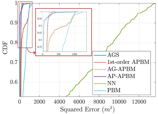 Each curve represents the average empirical cumulative distribution function (CDF) of squared error of position estimation. The average was computed over 200 MC simulations.
