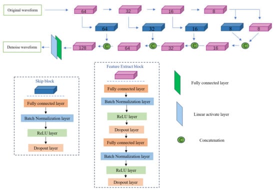 The network architecture is depicted in Figure 1. The model, principally comprising encoder, decoder, and skip connection (SK) blocks, is designed symmetrically. Each encoder and decoder block incorporates eight hidden layers, which include two fully connected layers, two normalization layers, two non-linear activation function layers, and two dropout layers. During the encoding phase, the model employs five encoder blocks to extract waveform features from the noise data, with the layer neurons in the fully connected layers decrementing sequentially from 64 to 32 to 16 to 8, and finally stabilizing at 8. In the decoding phase, four decoder blocks are utilized to reconstruct the denoised data, with the neurons in the fully connected layers of the decoders increasing in reverse order from 8 to 16 to 32 to 64. Additionally, the number of neurons in each skip connection block corresponds to the neuron count in the encoder blocks at the same level.