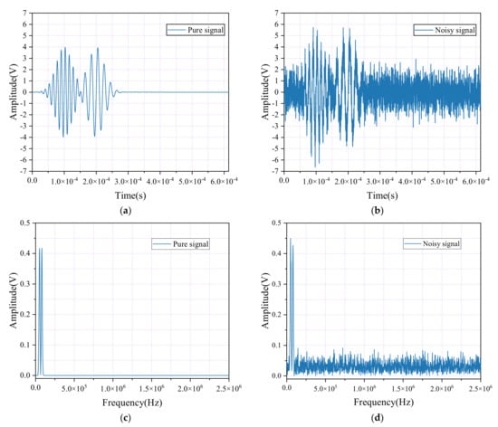 Time-domain waveforms and spectral diagrams of simulated AE signals and noisy AE signals. (a) Waveform diagram of the simulated AE signal; (b) Waveform diagram of the simulated AE signal with noisy; (c) Spectrum diagram of the simulated AE signal; (d) Spectrum diagram of the simulated AE signal with noisy.