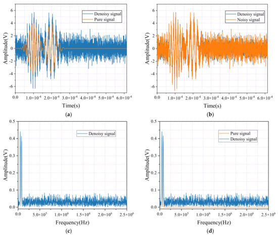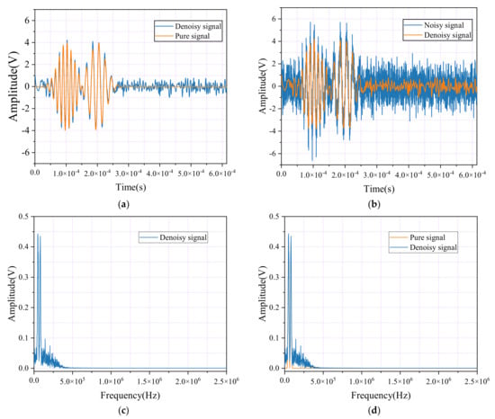 Time-domain waveforms and spectral diagrams of simulated AE signals, noisy AE signals, and denoise AE signal by the wavelet packet. (a) Waveforms of the AE signal and denoise AE signal; (b) Waveforms of the AE signal with noisy and denoise AE signal; (c) Spectral diagram of the AE signal and denoise AE signals. (d) Spectral diagram of the AE signal with noisy and denoise AE signals.