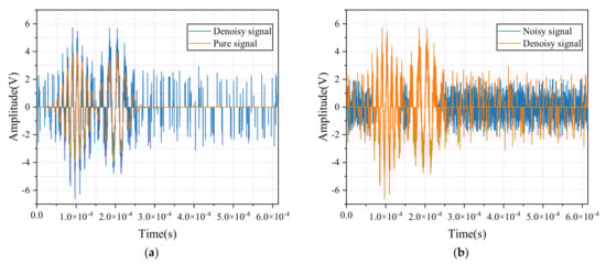 The subsequent diagram illustrates the impact of the Hilbert transform method (HTM) denoising treatment, featuring two key comparative visualizations. As shown in Figure 4a, the comparison between the pure signal and the denoised signal is presented, while Figure 4b contrasts the noisy signal with its denoised counterpart. After applying the Hilbert transform for denoising, it is clear that low-frequency noise components have been effectively reduced, leading to significant noise reduction in specific frequency bands and a notable enhancement in the signal’s overall smoothness. However, it is important to note that the Hilbert transform did not completely eliminate the high-frequency noise components. This residual high-frequency noise introduces minor fluctuations and distortions in the finer details of the signal. While the improvements in noise reduction are evident, the remaining noise still slightly impacts the signal’s overall integrity.