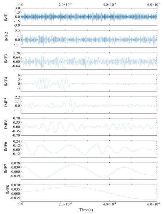 As shown in Figure 5, after undergoing CEEMDAN denoising, a simulated AE signal is decomposed into several intrinsic mode functions (IMFs), consisting of nine significant IMF components. A detailed analysis of these components reveals that each IMF exhibits distinct frequency characteristics and temporal variations, highlighting the complexity of the original signal. The characteristics of each IMF can be observed through both time-domain representations and spectral graphs, providing deeper insights into the signal’s intricate structure.