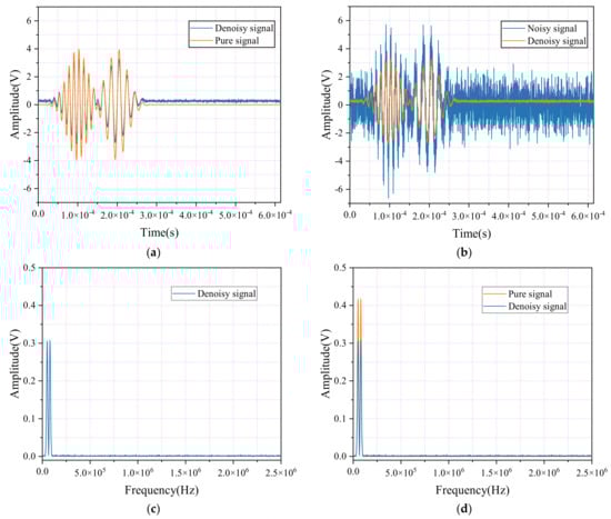 Additionally, as shown in Figure 3c,d, the amplitude of the denoised signal at specific frequencies has not significantly decreased; in some instances, the peaks are comparable to or even exceed those of the original signal. This indicates that the denoising process was ineffective in sufficiently removing noise and may have inadvertently weakened valuable signal components or introduced new interferences. These findings highlight the limitations of the wavelet packet decomposition method in this case, as it struggles to restore the pure signal’s structure and details effectively.