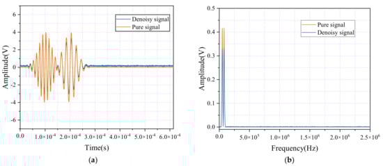 Due to the inherent noise in AE signals collected during experiments, obtaining a pure waveform signal is nearly impossible. To evaluate the performance of different denoising methods in a controlled environment and provide a consistent benchmark for comparison, employing simulated signals serves as an effective solution. In 1985, Mitrakovic et al. proposed a digital model to describe AE signals []. Simulated signals allow for the generation of clear signals without background noise, facilitating precise control over various signal parameters, such as the frequency, amplitude, and phase. Although the noise in practical AE signals is not broadband, introducing broadband noise into the simulated signals helps to test the generalization and adaptability of the denoising algorithms. The formula for the simulated signal is as follows: