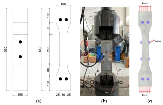 As illustrated in Figure 11, an MTS fatigue testing machine was employed for the experiment. The universal testing machine operated under displacement-controlled loading at a rate of 1 mm/min. The acoustic emission equipment parameters were consistent with those used in the previous section for the tensile testing of SFRC, ensuring uniformity in signal monitoring and analysis across both experimental setups.