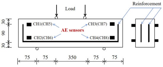Analysis of SNR. The dimensions of the RC beam and the arrangement of the AE sensors.