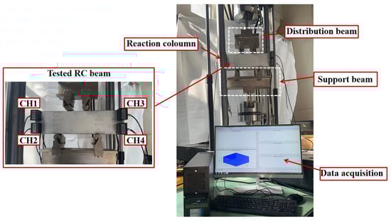 The experiment was carried out using a hydraulic servo actuator testing machine equipped with a data acquisition system and an AE monitoring system, as depicted in Figure 13. All the RC beams were loaded vertically at a slow rate of 0.1 mm/min to ensure the accurate acquisition of the AE data. The AE signals were monitored using the Express II-Micro eight-channel AE system, managed through the AE win software. A total of eight sensors were strategically arranged on the specimen, as shown in Figure 1, with high vacuum grease applied as an acoustic coupling agent to secure the sensors to the beam surfaces and minimize AE signal attenuation due to contact gaps.