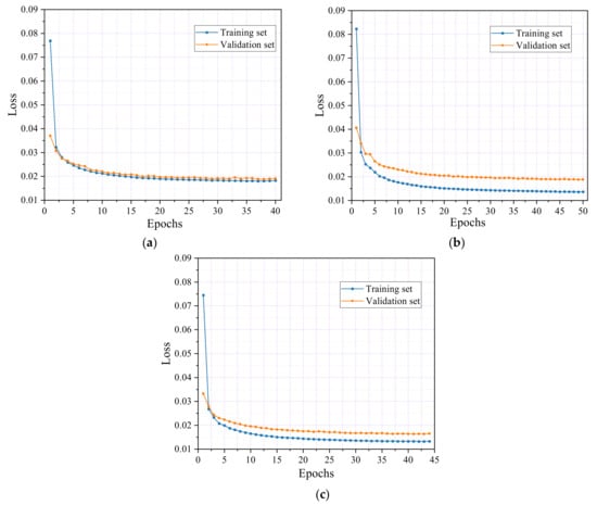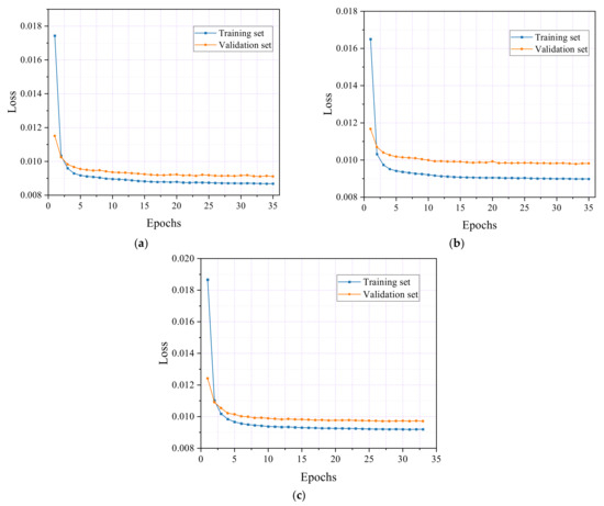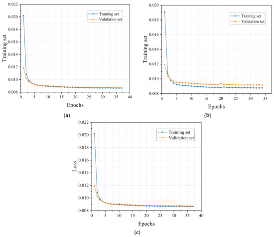 Finally, Figure 16c shows the results for specimen F3, where the training set’s loss rate stabilized at 0.009, and the validation set’s loss rate decreased to 0.0092 after ten epochs. The training was halted at 34 epochs, resulting in final loss rates of 0.0087 for the training set and 0.0088 for the validation set. The marginally higher loss rate observed in the validation set compared with the training set indicates that the model effectively avoids overfitting.