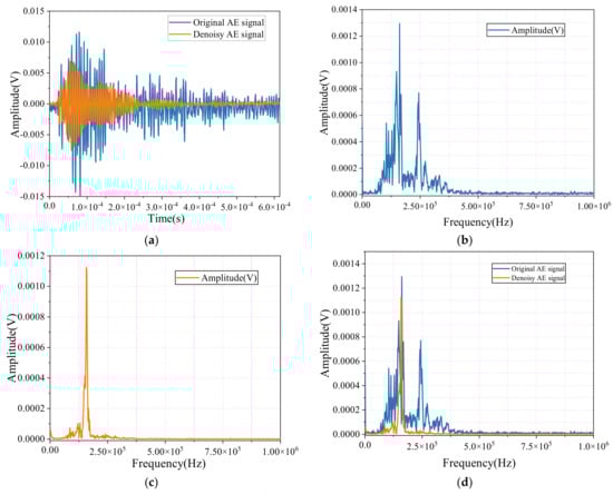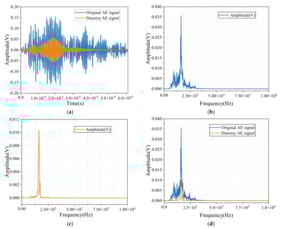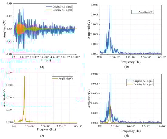 Figure 17b–d present the spectral graphs of the AE signals. In Figure 17b, the spectrum of the original signal shows a wide distribution of frequencies, with the energy spread across multiple frequency bands. This indicates a significant presence of interfering noise, which dilutes the meaningful information in the signal and complicates its analysis.