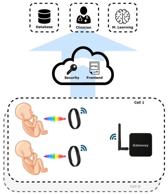 The system’s operative environment of this wearable device could be inside a hospital or at the houses of patients. As presented in Figure 1, an example scenario could be based on measurement cells with non-invasive continuous measurement devices installed on newborn patients. Each cell has a gateway that controls and reads the acquired data of the devices via short-range wireless communication. Beyond this, each gateway communicates through a mobile or wired network to the web server, which records the data in a database, enabling the operation of ML algorithms for data classification. A clinical front-end for data visualization and alarm settings is also presented.